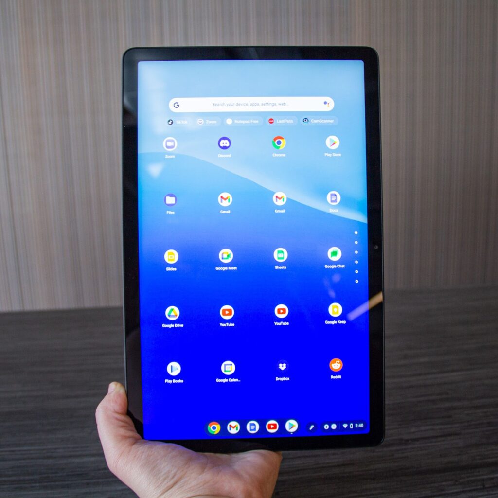Lenovo Chromebook Duet menggunakan prosesor MediaTek Helio P60T, RAM 4GB, dan penyimpanan eMMc hingga 128GB.