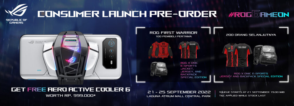 Untuk pemesanan awal ini, kalian akan mendapatkan banyak promo menarik antara lain Free Aero Active Cooler 6 + Devil Case + Exclusive Backpack ROGXONIC Esports selama persediaan masih ada, dengan total keuntungan hingga Rp2.000.000.