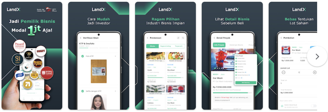 Aplikasi investasi properti yang sudah berizin OJK bernama LandX ini menawarkan berbagai rumah dan bangunan. Misalnya jika ada sebuah rumah yang dijual dengan harga Rp500 juta dengan satu lot dihargai Rp5 juta.