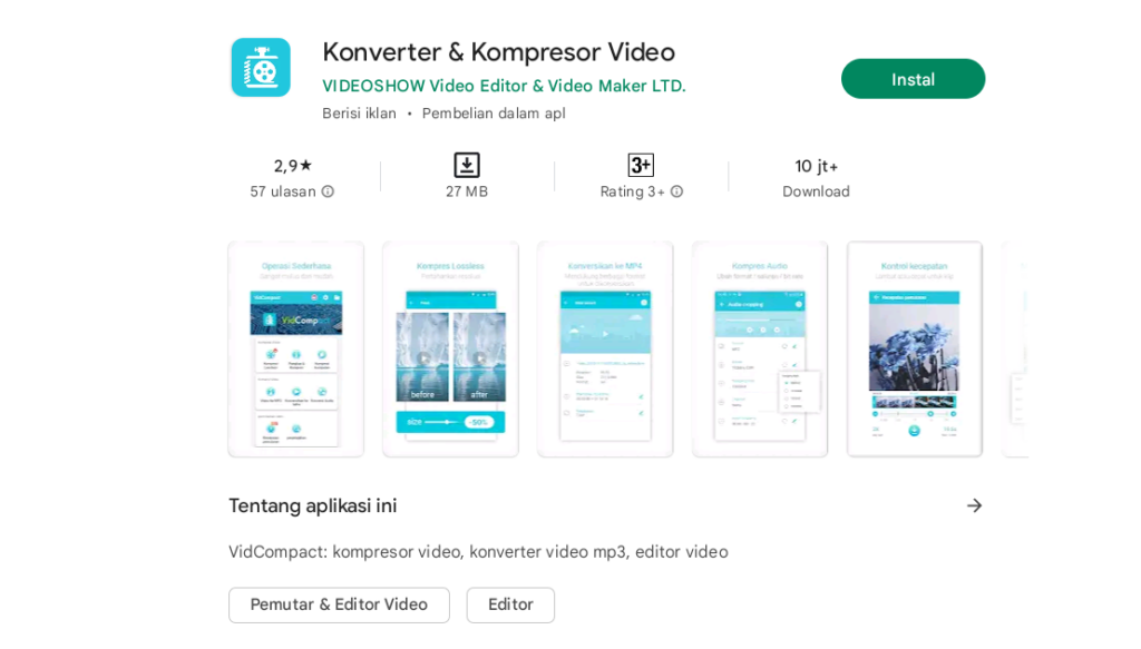 VidCompact merupakan salah satu aplikasi kompres video android terpopuler yang sudah diunduh lebih dari 100 juta kali. Aplikasi ini menyediakan banyak fitur seperti pemangkasan video, mengkompresi video, mengganti nama dan lain-lain.