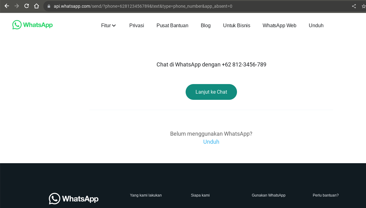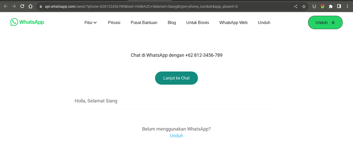 Nantinya, ketika link tersebut di klik, maka otomatis akan beralih ke halaman website dan memasukkan ke chatroom nomor WhatsApp yang tertera.