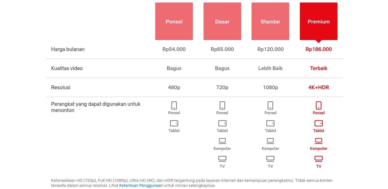 Netflix memiliki empat paket langganan yang dibedakan dari kualitas video yang tersedia, jumlah device yang bisa menggunakan akun, serta jumlah orang yang bisa menggunakan akun Netflix yang sudah didaftarkan.