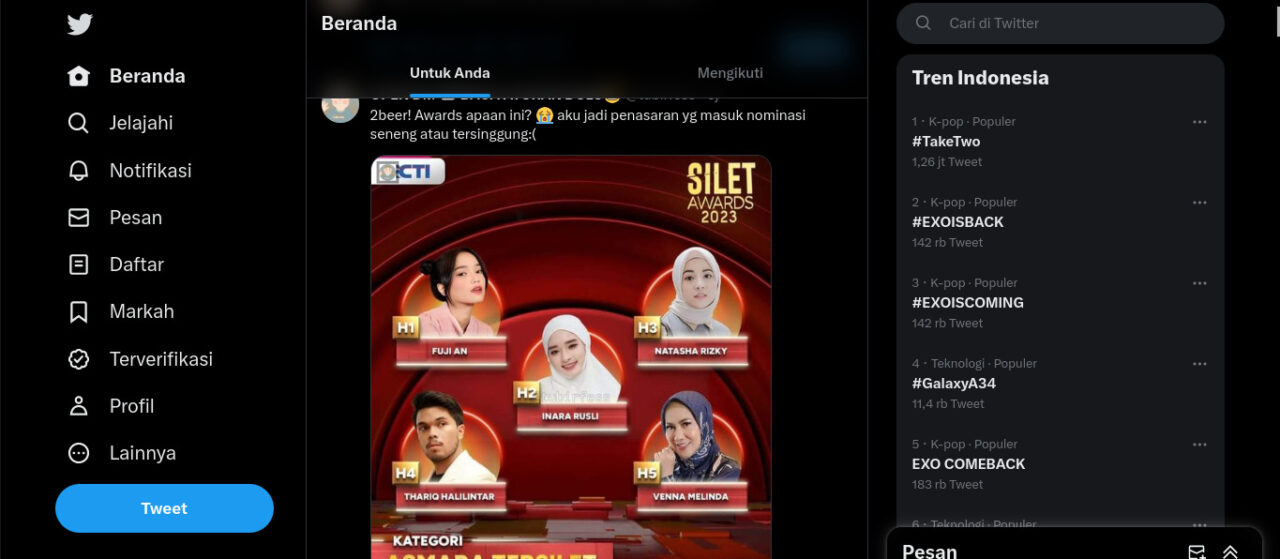 Pengguna dapat mengklik pada salah satu topik yang sedang trending untuk melihat tweet-tweet terkait, termasuk tweet dari pengguna Twitter lain yang membahas topik tersebut.