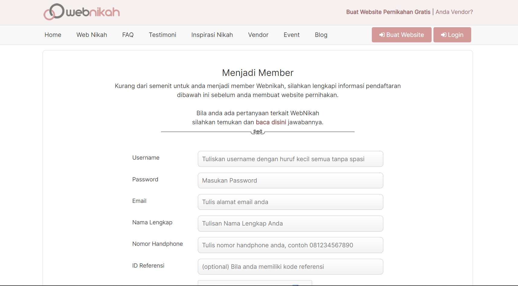- Langkah pertama cara membuat undangan website gratis sendiri adalah membuka situs pembuat website undangan pernikahan online gratis bernama webnikah.com