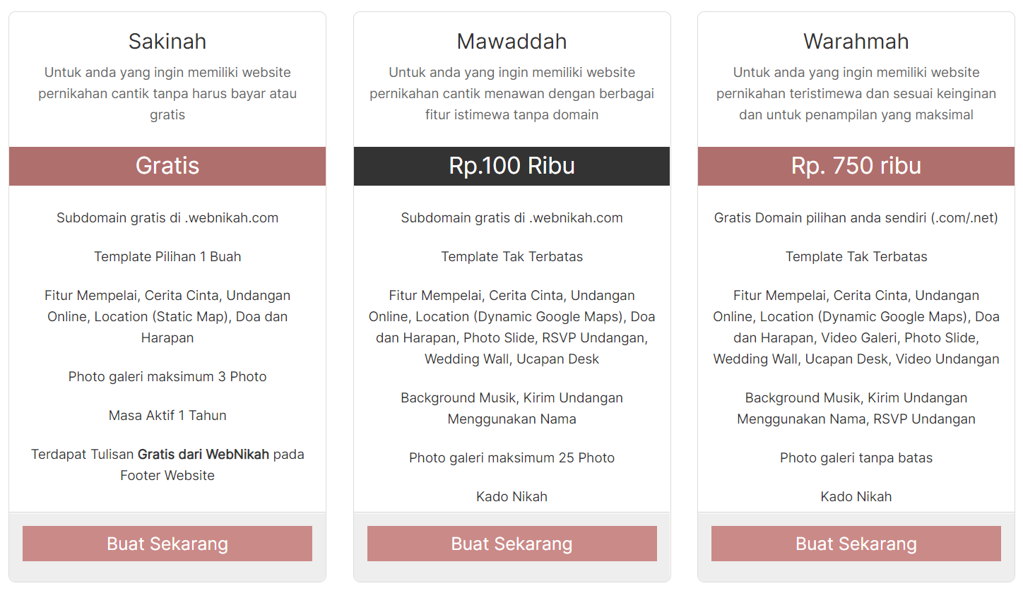 Paket ini bisa digunakan secara gratis tanpa biaya apapun. Kalian bisa membuat subdomain sendiri gratis di .webnikah.com. Sudah tersedia template, fitur mempelai, cerita cinta, undangan online, location (static map), doa dan harapan, galeri foto (maks 3).