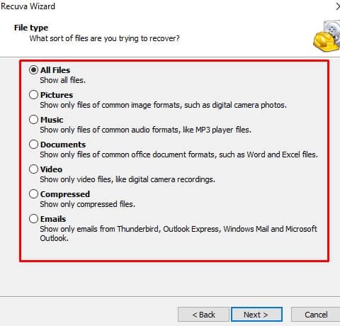 - Pilih jenis file yang ingin di-recover, karena ini akan mengembalikan video, maka pilih opsi file video.
