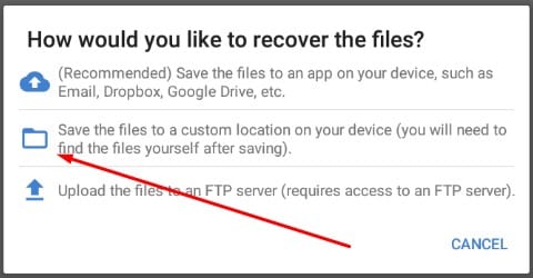 Untuk menyimpan file video yang sudah di-recover di memory HP, pilih opsi Save the files to a custom location.