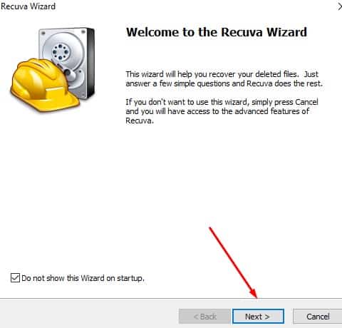 - Jika sudah menginstall aplikasi Recuva, maka akan muncul jendela Recuva Wizard. Langsung saja klik Next.