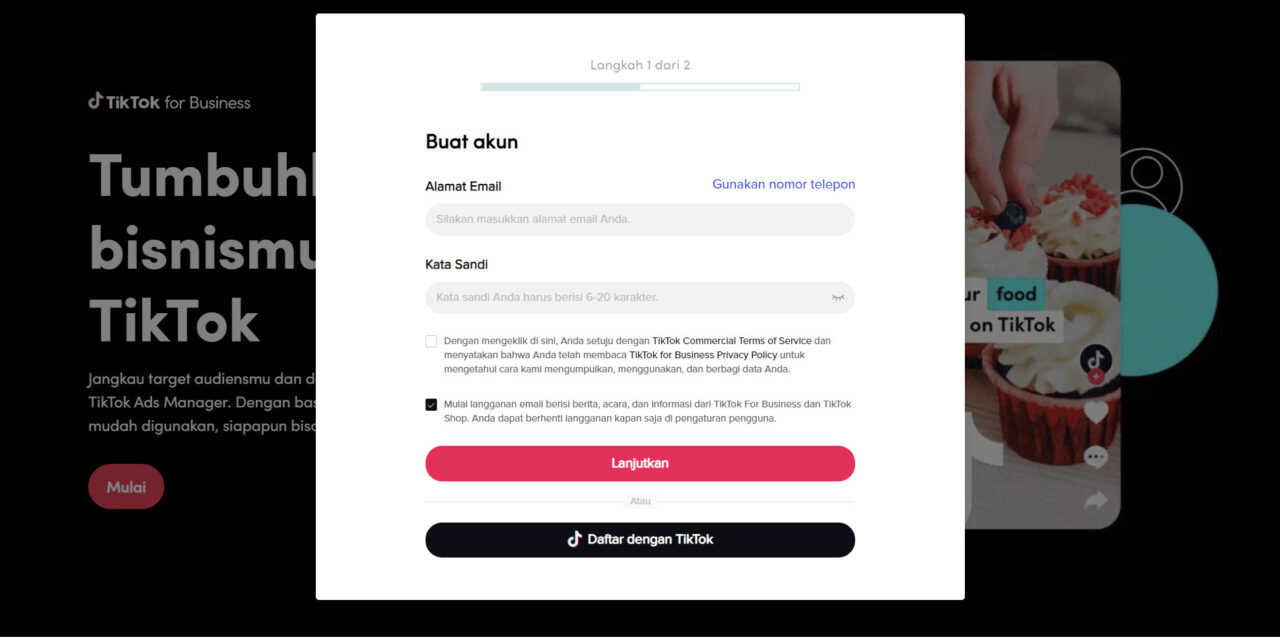 Nantinya kalian akan diarahkan ke halaman login. Jika kalian baru pertama kali membukanya, silakan buat akun terlebih dahulu dengan mengeklik tombol sign-up. Lalu akan diarahkan kembali ke halaman TikTok Ads dan silakan ikuti petunjuk pembuatan akun iklan TikTok. Isi semua formulir dengan benar.