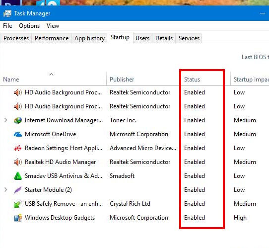 - Status merupakan status aplikasi tersebut, yang berisi apakah fitur auto startupnya aktif atau tidak. Apabila disable maka berarti tidak aktif,sedangkan enable berarti aktif.