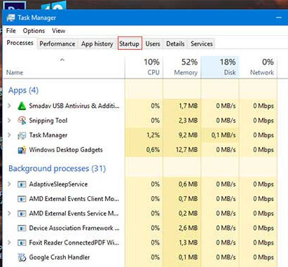 Detail aplikasi yang berjalan akan ditampilkan meliputi penggunaan CPU, Memory, Disk, Network, dan GPU. Langsung saja pilih Tab Startup untuk pengaturan Startup.