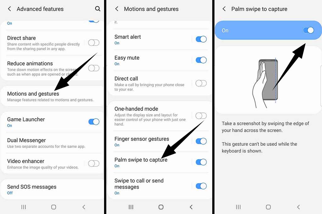 - Kemudian aktifkan pilihan usapkan telapak tangan untuk mengambil tangkapan layar. Pastikan toggle di sebelah kanan sudah berwarna biru.