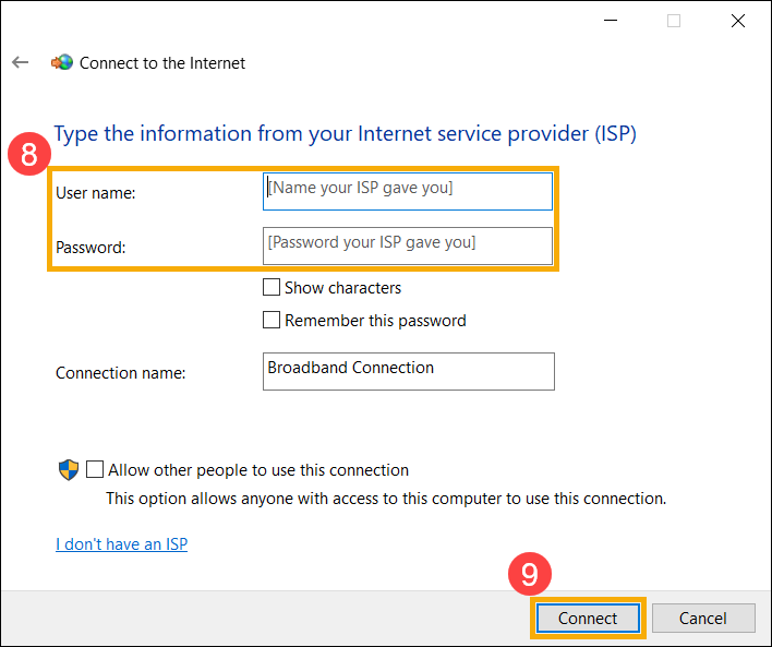 • Pastikan username dan password yang dimasukkan sudah benar, lalu pilih dan klik Connect.