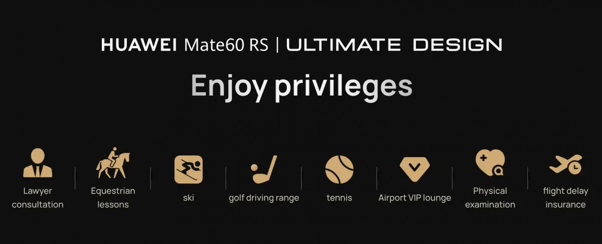 Huawei memberikan bonus eksklusif selama setahun bagi pemilik Mate 60 RS Ultimate Design yang mengajukan kartu Huawei, termasuk layanan ruang tunggu VIP di bandara dan stasiun kereta api, asuransi penundaan penerbangan, konsultasi hukum, dan bahkan pelajaran berkuda.