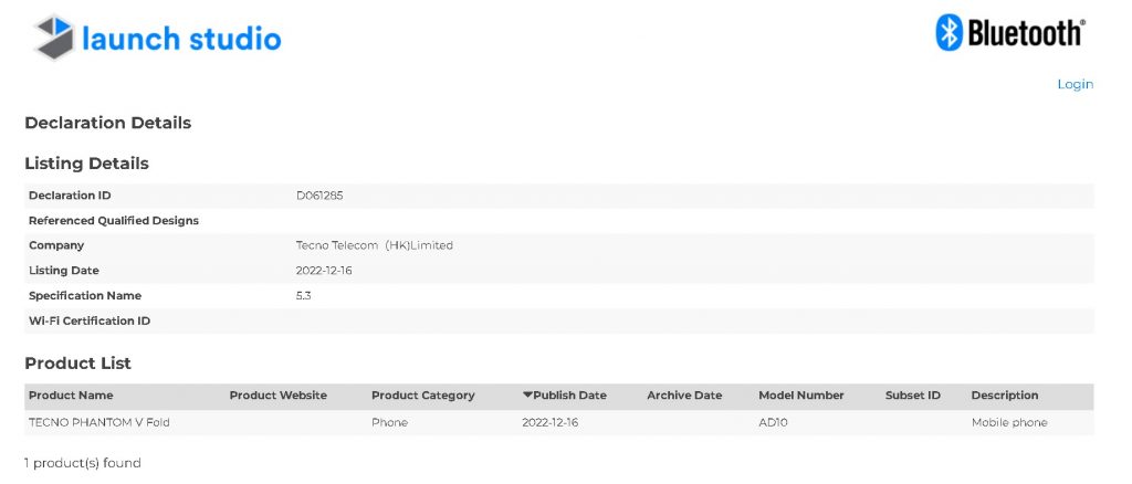 Perangkat telah mengantongi sertifikasi Bluetooth SIG. Perangkat tersebut dijuluki sebagai Tecno Phantom V Fold dan sudah terdaftar dengan nomor model AD10.