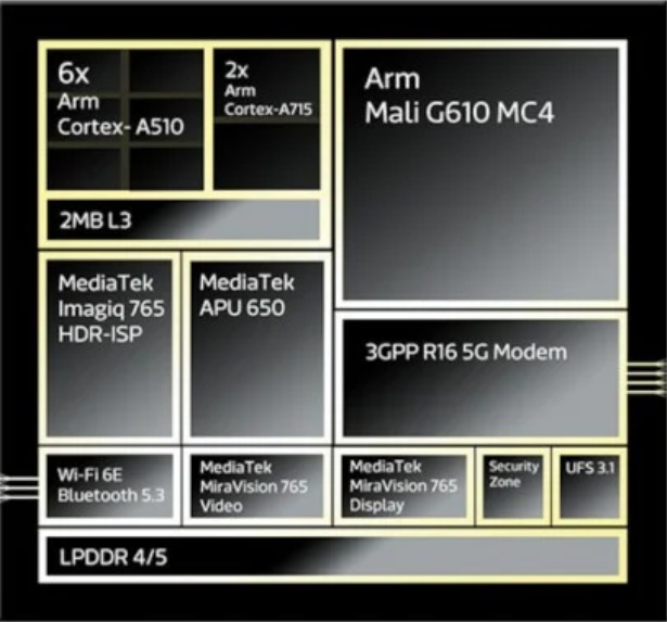 Prosesor tersebut menampilkan dua inti Cortex-A715 dengan frekuensi tinggi 2.8GHz dan enam inti Cortex-A510. Ada juga GPU Mali G610 MC4 untuk menangani visual pada perangkat.