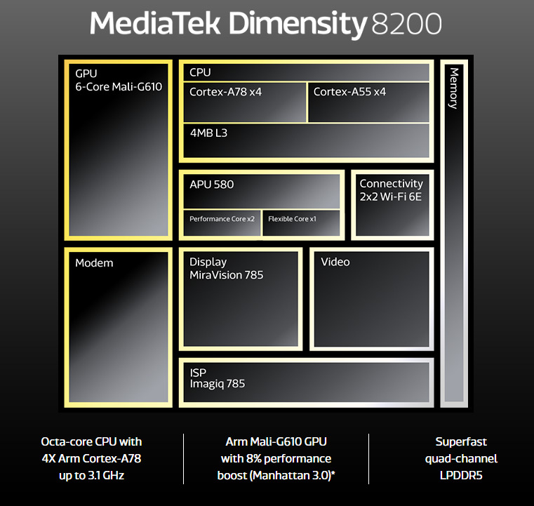 Lebih lanjut, Chipset MediaTek 8200 memiliki empat inti Cortex-A78 dan empat inti Cortex-A55. Satu inti A78 dengan clock 3.1GHz, tiga inti A78 pada 3.0GHz, dan empat inti efisien A55 pada 2.0GHz.