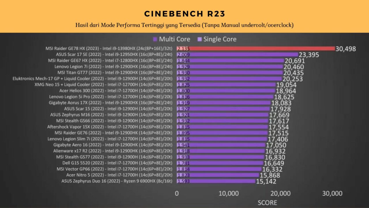 LABTekno.com – MSI Raider GE78 HX 13V merupakan produk terbaru dari MSI yang menggunakan duet CPU & GPU terbaik saat ini. Pantas jika hasil test Cinebench R23 menunjukkan bahwa laptop ini mampu mencapai skor lebih dari 30K. Jauh mengungguli performa laptop lainnya.