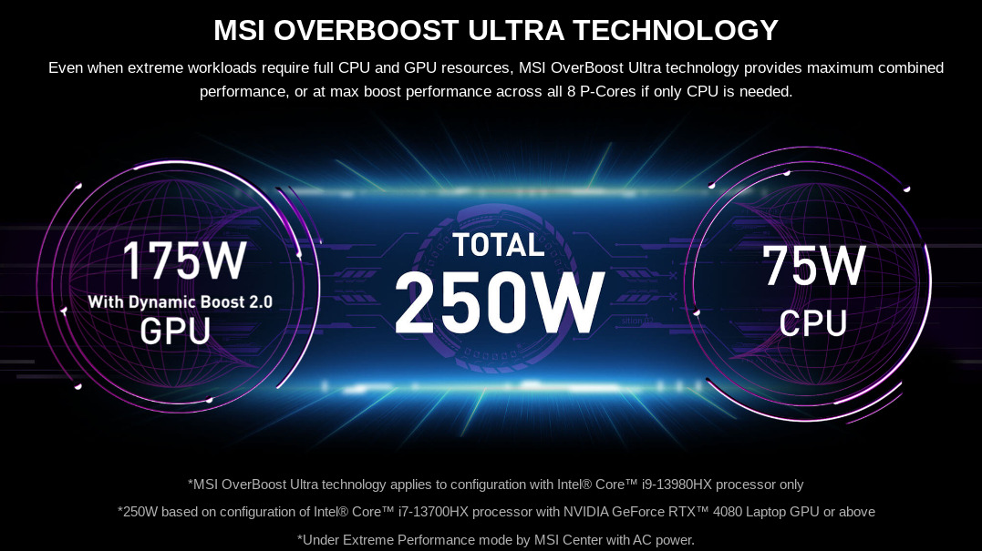 Laptop ini juga mengemas Overboost MSI yang memungkinkan CPU dan GPU menggabungkan amplop daya mereka, memberikan CPU total 250W saat GPU diam.