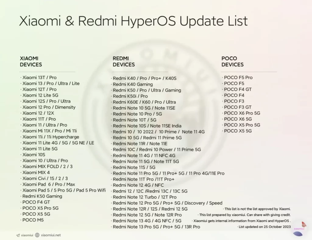 Xiaomi, sebagai salah satu merek terkemuka di bawah Xiaomi Corporation, menawarkan sejumlah besar perangkat yang kemungkinan besar akan mendapatkan update HyperOS.