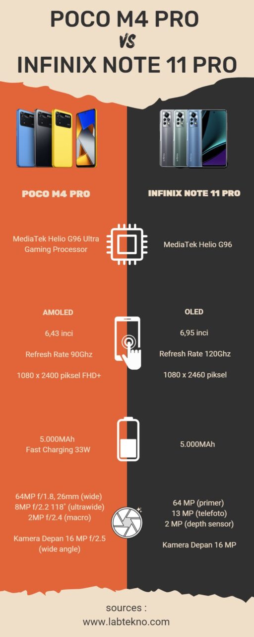 Secara keseluruhan jika dibandingkan berdasarkan spesifikasi sebenarnya hampir mirip, baik itu dalam segi Prosesor, kartu grafis, RAM, kapasitas penyimpanan, dan kapasitas baterai pun sama. Hanya ada beberapa perbedaan pada beberapa segi. Misalnya dalam segi refresh ratenya, Poco M4 Pro mencapai 90Ghz, sedangkan Infinix Note 11 Pro mampu 33,33% lebih baik yaitu 120Ghz.