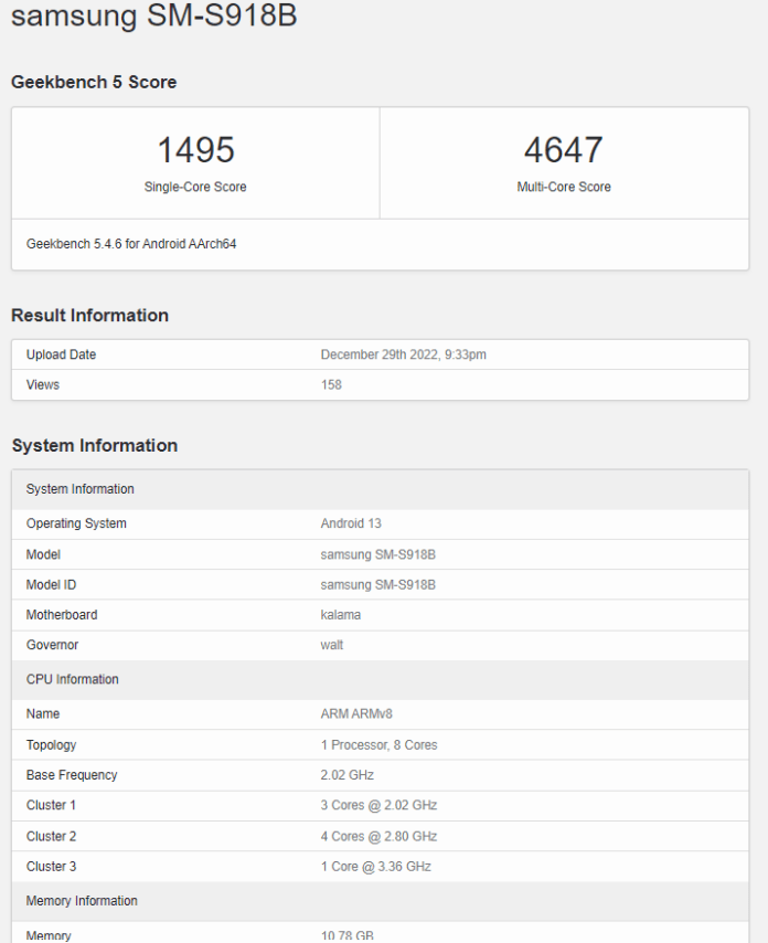 Varian spesifikasi teratas Galaxy S23 Ultra telah terlihat di database Geekbench. Pada gambar di atas, menunjukkan bahwa perangkat ini akan memiliki RAM 12GB, menjalankan Android 13 dan ditenagai oleh CPU Snapdragon 8 Gen 2.