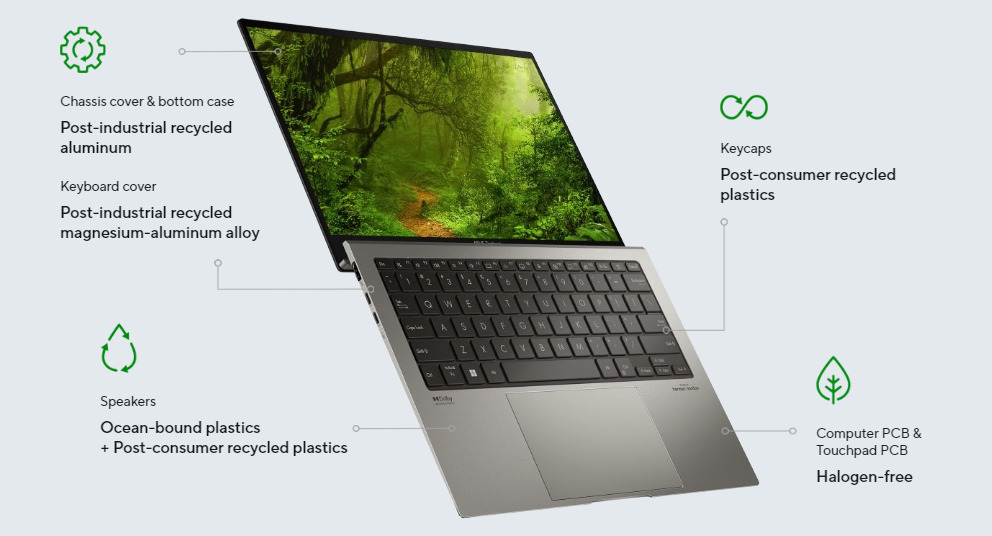 Mulai dari bahan dan proses pembuatan, perakitan, penggunaan, hingga proses daur ulang di akhir masa pakai, siklus hidup Zenbook S 13 OLED (UX5304) telah dirancang untuk meminimalkan jejak karbon, menjadikannya laptop yang ramah lingkungan.