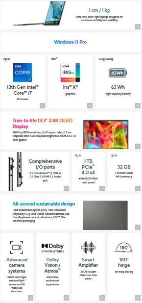 Soal performa, laptop super tipis dan ringan dari ASUS ini juga menawarkan pengalaman komputasi yang powerful dan efisien dengan menggunakan prosesor 13th Gen Intel® Core™ i7-1355U bersertifikasi Intel® Evo™ platform.