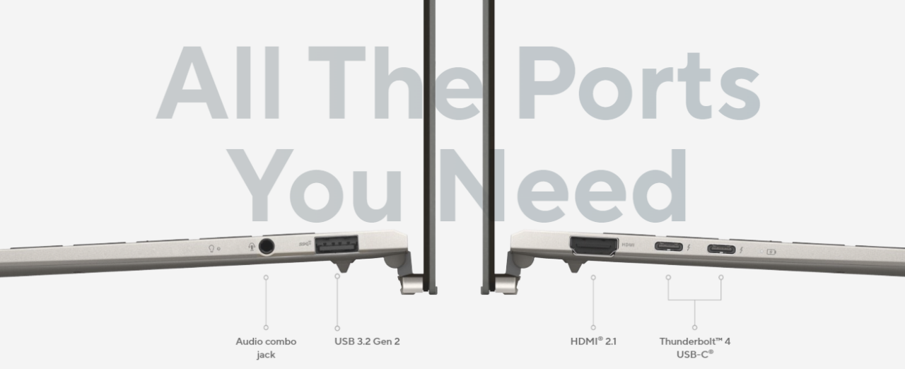 Termasuk dua port USB Type-C® Thunderbolt™ 4, port USB 3.2 Gen 2 Type-A, port HDMI® 2.1, dan 3.5mm combo audio jack.
